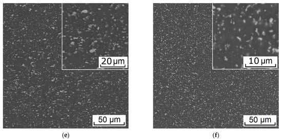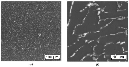 As can be seen from Figure 8e,f, this mode led to the spheroidization of Fe-containing particles. According to previous works on alloys of the Al–Zn–Mg–Ca–Fe system [,], it is precisely this structure that makes it possible to provide a high deformation plasticity. However, based on the fact that additional deformation heating of the billet occurs during the RSR process (which can lead to partial melting), heating at 450 °C was chosen. This temperature corresponds to the rolling temperature (selected from the simulation results); thus, homogenization was combined with heating before RSR.