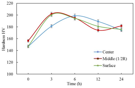 To estimate the degree of hardening in different zones of the rod processed by RSR, the effect of aging time at 150 °C on the hardness (after quenching from 450 °C) was studied. It was found that after 3 h of exposure, the hardness in the center of the rod was approximately 20 HV lower than in the remaining zones (Figure 10). However, after 6 h, the hardness values almost levelled out (195–200 HV).