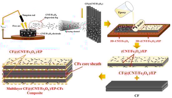 Adding nanofillers is one of the effective methods to prepare high performance composites [,,]. Carbon nanotubes (CNTs) have excellent thermal and electrical properties [,] and are often used as an ideal material to enhance thermal/electrical conductivity properties of CF composites [,]. Moreover, because of their good dielectric loss characteristic, CNTs are a good choice for EMI shielding materials [,,], and CFs have similar characteristic [,,]. However, if CNTs and CFs are simply combined, although CF-CNT composites have good thermal and electrical properties, lacking magnetic property and impedance mismatch [] will make CF-CNT composites have weak electromagnetic wave absorption and high electromagnetic reflectance, which result in secondary electromagnetic pollution [,]. The matching of electrical and magnetic properties is the key to obtain good shielding effect in the wide frequency range []. Therefore, in order to supplement the magnetic property lacking for CFs and CNTs and enhance magnetic loss, Fe3O4, Fe2O3, Fe, Ni, Co and other magnetic particles are usually introduced to cooperate with CNTs [,,,]. Main methods include in situ growth [,] and mechanical blending [,]. Among of them, Fe3O4 has a low toxicity and good biocompatibility as a more efficient shielding material. Furthermore, because of the large saturation magnetization of Fe3O4, they can provide a high value of complex permeability. Fe3O4 can exhibit the skin effect, their high resistivity allowing the electromagnetic waves to enter effectively. Therefore, CNT/Fe3O4 as a material with dual magnetic and dielectric properties could be important to achieve excellent thermal, electrical and EMI shielding effectiveness. On this basis, Li et al. [,] propose a free arc dispersion method, which can rapidly disperse nanomaterials and produce nanomaterials dispersion fog with good dispersion degree in the air. In addition, this method can disperse variety of nanomaterials at the same time, and the dispersed nanomaterials have a good mixing effect. This seems to well meet the need of collaborative use for the Fe3O4 and CNTs.
