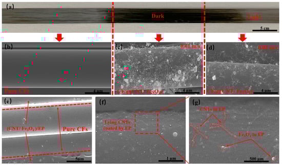 (a) Pure CFs at the left, CF@(CNT/Fe3O4) with high content CNT/Fe3O4 at middle, and low content CNT/Fe3O4 at right. (b) SEM of pure CFs. (c) CF@(CNT/Fe3O4) with no rolling and high content CNT/Fe3O4, and (d) with no rolling and low content CNT/Fe3O4. (e) CF@(CNT/Fe3O4)/EP with rolled treatment, CFs in the middle and CF@(CNT/Fe3O4) on both sides. (f,g) CF@(CNT/Fe3O4)/EP locally enlarged image; lying CNTs are coated by EP.