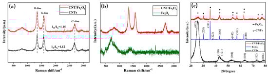 Raman spectral comparison of CNT/Fe3O4 and CNTs (a), and CNT/Fe3O4 and Fe3O4 (b), XRD of Fe3O4, CNTs and CNT/Fe3O4 (c).