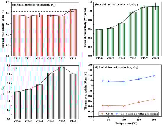 Radial thermal conductivity λ⊥(a), axial thermal conductivity λ‖ (b), and λ‖/λ⊥(c) of multilayer CF@(CNT/Fe3O4)/EP-CFs composite, λ⊥ comparison of roll treatment (d).