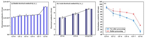 Radial electrical conductivity (σ⊥) of multilayer CF@(CNT/Fe3O4)/EP-CFs composite is shown in Figure 5a. The σ⊥ of CF-0 to CF-7 is generally stable, maintaining at 1.1 × 10−4 (S/cm), while the σ⊥ of CF-8 is increased to 1.7 × 10−4 (S/cm), showing a slight improvement. The main reason is that CNTs has low resistance/high electrical conductivity (105–107 S/m) [,], and adding CNTs to the composite can improve electrical conductivity. Similar to the thermal conductivity, due to the insulation effect of (CNT/Fe3O4)/EP and CFs core sheath, the cross-plane electrical conduction in multilayer CF@(CNT/Fe3O4)/EP-CFs composite is difficult to carry out. Because CF-8 does not have CFs core sheath and CNTs enhance the electrical conductivity of EP [], so the σ⊥ of CF-8 obtains some improvement.