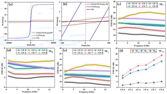 Figure 6f shows the average values (SEave) of SET, SER and SEA in X-band (8.2–12.4 GHz). When the amount of CNT/Fe3O4 is 0 (CF-0), the SEave of SET, SER and SEA are 10.56 dB, 2.03 dB and 8.53 dB, respectively. When the addition of CNT/Fe3O4 is increased to 0.64 mg/cm3 (CF-8), compared with CF-0, the SEave of SET, SER and SEA are increased by 172%, 159% and 175% respectively. The reason is that CF-8 contains Fe3O4 while CF-0 does not, so the magnetic loss and dielectric loss for Fe3O4 are missing, which greatly reduces the electromagnetic wave absorption effect and leads to relatively poor EMI shielding performance [,].