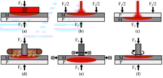 Schematic illustration of different thermal joining processes (P = polymer, M = metal): (a) heat conduction joining, (b) laser-heat conduction joining, (c) laser direct joining, (d) induction joining, (e) ultrasonic welding, (f) friction welding.