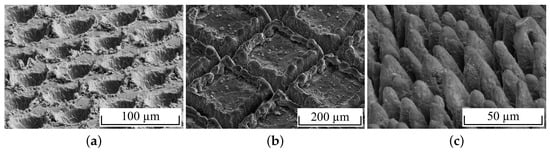 For surface pretreatment, mechanical blasting with, e.g., alumina is an industrially established, low-cost process for creating stochastically arranged, rugged structures that can achieve acceptable adhesion [4,5,6,8,12,20,34,47,48,49]. However, laser structuring is by far the most investigated pretreatment method. Thereby, material is removed from the metal surface by pulsed laser radiation with high power density. The high energy input causes rapid heating of the surface, which abruptly vaporises material. The achievable roughness, ablation depth and the resulting surface structure are determined by the process parameters power, pulse repetition frequency and pulse spacing, as well as the processing strategy [50]. Single pulse drilling is conducted to create crater-shaped ablations. Depending on the arrangement of the ablations, the resulting surface structure consists of single craters [8,9,28,35] (Figure 2a) or grooves [4,9,10,11,12,13,14,15,16,21,24,28,32,36,38] (Figure 2b). The wetting with molten polymer is often insufficient for single craters, since degassing of entrapped air is not possible [8,9,35]. Grooves are produced by tightly overlapping single ablations along a line or a grid. Since degassing is possible along the grooves, a better wetting behaviour than for single craters is achieved [9]. A second processing strategy is the formation of cone-like protrusions (CLP, Figure 2c) using spatially overlapped pulses of a laser beam. The nano- or micrometer-sized protrusions with high aspect ratio are densely arranged [8,17,51,52]. Advantages of CLPs are good wetting behaviour as well as the high achievable compound strength, which leads to almost pure cohesive fracture during strength testing [8,17]. The disadvantage is the slower processing rate compared to single pulse drilling due to the greater energy density required.