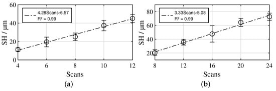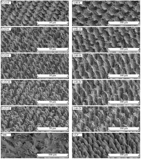 In the case of the L12 samples, deterministically distributed pins with of 11–45 µm are formed. increases monotonically with the number of scans (Figure 7a, = 0.99). The bottoms of the ablations show a relatively smooth surface, while the surface of the pins between the ablation craters consists of randomly arranged, rugged, solidified melt. As the number of scans increases, a thickening of the pins is observed in addition to an increase in . In the case of the L40 samples, is in the range of 20–73 µm. also increases monotonically with the number of scans (Figure 7b, = 0.99). L40-8- and L40-12-structures are formed from ablations with intervening ridges, on which solidified melt agglomerates. From 16 scans, more pin-shaped, tapered profile elements are formed. With 20 or 24 scans, the profile elements clearly form pins. The cross-sectional images in Figure 6 show that the tips of the profile elements consist of solidified melt that is not completely bonded to the base material. The CLP structure is characterized by stochastically distributed, steeply and conically shaped pins with of 71 µm and about 18 µm spacing. The MB structure has the highest of 101 µm of all the surface structures studied. The surface is rugged and has many sharp edges.