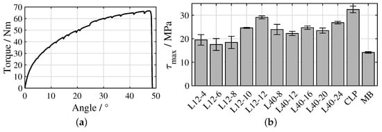 An exemplary angle/torque curve of the hollow cylinder torsion test is illustrated in Figure 8a, showing a decrease in stiffness with increasing load due to viscoelastic softening of the PA6. Figure 8b illustrates for all investigated samples. For the L12 structures, a stagnation of in a range of 17.6–19.5 MPa can be seen from L12-4 to L12-8, while from L12-8 to L12-10, as well as from L12-10 to L12-12, there is a clear increase to 24.6 MPa and 29.1 MPa, respectively. and show moderate correlation with = 0.78 (Figure 9a). In the case of the L40 structures, from L40-8 to L40-20 varies randomly in a small range of 22.2–24.7 MPa, only in the case of the L40-24 structures is there a moderate increase to 26.8 MPa. and show only low correlation with = 0.34 (Figure 9b). The CLP structure reached the highest of 32.5 MPa, whereas the MB structure reached the lowest with 14.2 MPa.
