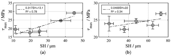 With reference to the working hypotheses, the obtained results for the L12 structures are interpreted as follows: In each case, the laser structuring process produces a completely remelted surface, which, thus, already exhibits a sub-roughness deviating from the untreated metal surface in all areas at a low number of 4 scans. This already leads to an acceptable shear strength. Increasing the number of scans to 6 or 8 results in an increase in the height of the pin-shaped profile elements and, thus, an increase in . However, when loaded, the pins bend over rapidly without initially causing an increase in shear strength. A further increase in the number of scans to 10 or 12 results in a further thickening of the pins due to additional available melt, so that the bending of the pins only occurs at higher loads. Consequently, the correlation between and is only moderate (Figure 9a) and Hypothesis 4 is only partially confirmed. However, Hypotheses 1, 2 and 3 are confirmed completely since pin structures are created in every case, the wetting behaviour with PA6 is comparable to the CLP samples and highly correlates with the number of scans (Figure 7a).