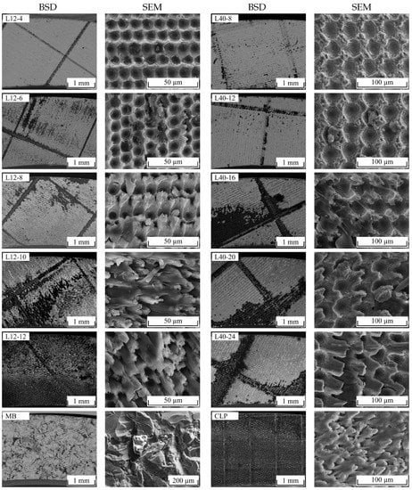 In the case of the L40 samples, the fracture surfaces in the BSD images show only small amounts of polymer residues for each of the L40-8 and L40-12 structures, while L40-16, L40-20 and L40-24 structures each show a comparable amount of polymer-covered area. In the SE images, however, polymer residues can be identified on the ridges between the ablations, especially in the L40-8 structure. The polymer adheres to the ridges in the substructures and breaks cohesively in these areas when loaded. In the L40-12 structure, this effect remains in a reduced form. From the L40-16 structure onwards, more pin-shaped profile elements form between the ablations, which bend over under shear load. In some places, entire areas of the polymer are broken, while in other places hardly any polymer residues are visible. From the L40-20 structure onwards, the direction of loading is clearly recognisable from the orientation of the bent pins. As with the L40-16 structure, entire areas of the polymer are broken out in some places, while hardly any polymer residues are visible elsewhere. The fracture surface of the L40-24 structure is characterised by bent pins with torn-off tips. The tip, consisting of solidified melt, is barely connected to the base material, as can be seen in Figure 6, and breaks under load. Polymer residues are partially visible between the bent pins. A considerable portion of the surface is covered with completely torn out polymer.