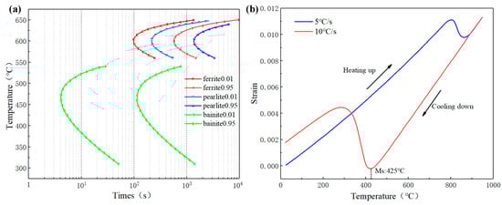 Phase transformation kinetic parameters of 9310 with 0.1% carbon content: (a) TTT diagram; (b) Dilatometric curve.