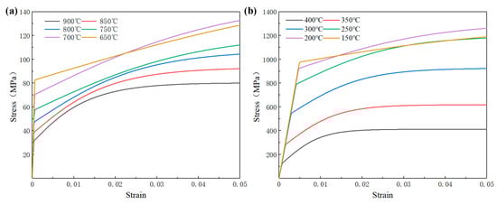 The austenite-martensite transformation during the quenching process, the thermal conductivity, and the specific heat capacity of different phases are shown in Table 4. The maximum strain generated during heat treatment is only 2~3%. The austenite and martensite stress-strain curves corresponding to different temperatures at a strain rate of 0.01 were calculated by DANTE. Figure 4 shows the stress-strain curve of austenite and martensite. The yield stress of austenite and martensite gradually increases as the temperature decreases, and the yield stress of martensite is far greater than the yield strength of austenite. The elastic modulus and plastic modulus can be determined by the stress-strain curve, and the final stress-strain curve of the material follows the linear superposition rule.