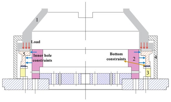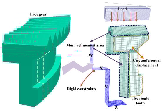 The heat treatment process route of the face gear is shown in Figure 5. The heat treatment process of the face gear included carburizing, high temperature tempering, and die quenching with the total time being 14 h. Due to the symmetry of the gear structure, 1/142 of the gear was selected for modeling to shorten the calculation time. In the simulation of carburizing and quenching, the calculation accuracy of carbon potential gradient and temperature gradient on the surface of the gear was affected by the mesh size, and it was necessary to refine the mesh on the surface of the gear. The finite element model was divided by hexahedral mesh, including 60,620 elements and 66,563 nodes. The mesh in the carburized area was locally refined, where the refinement layer depth was 1 mm, and the mesh thickness was 0.1 mm. The face gear was mainly constrained by the inner hole support ring W, X, Y, and the lower die Z in the die quenching process. Meanwhile the upper die applied a load of 71 KN vertically down to the top of the gear. The dies were set as a rigid body, where the dies and gear surface contacted with the surface during loading, and unloaded after quenching. The contact type between the die and the gear was surface to surface contact. To prevent penetration between contact pairs, the normal contact was hard contact. Considering the cyclic symmetric structure of the gear, a cylindrical coordinate system was established on the cyclic symmetric plane of the gear to limit the circumferential displacement and allow the gear to expand radially. Finite element meshing and boundary constraints of face gear are shown in Figure 6.