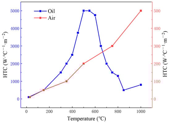 Heat transfer coefficient (HTC) of quenching oil and air cooling.