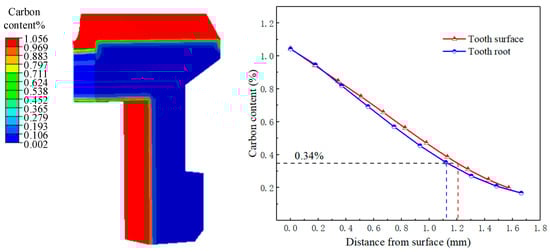 The phase transformation temperature of the carburized gear is affected by the carbon content. The time of the phase transformation in each part of the gear can be determined by comparing the temperature history with the microstructure transformation. The carbon content distribution of the face gear after carburizing is shown in Figure 8. The carbon content of the tooth surface was 1.05%, and the carbon content of the core was 0.1%. With the increase of the depth from the surface, the carbon potential gradually decreased. The carbon content of the tooth surface was higher than that of the tooth root. With 0.34% carbon content as the standard, the depth of the tooth surface carburizing layer was about 1.2 mm, and the depth of the tooth root carburizing layer was 1.1 mm.