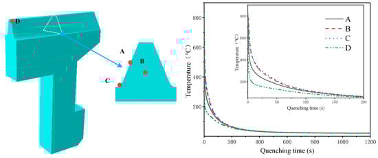 The specific locations of the points and the temperature changes during quenching are shown in Figure 9 (tooth surface: point A, core: point B, tooth root: point C, and tooth top: point D). The temperature of each point changed drastically within 200 s, and the temperature difference between inside and outside was essentially eliminated at around 400 s. The gear surface points A, C, and D were in direct contact with the quenching oil, and the temperature dropped rapidly. The temperature change rate of point D on the tooth top was the fastest, and the temperature change rate of point C at the root was the slowest. The temperature drop rate of point B was lower than that of point A due to the internal heat transfer of the gear. The temperature change curves of point B and point C were basically the same. The results showed that the temperature change was affected by the shape of the part, where the temperature at the top of the tooth changed most dramatically.