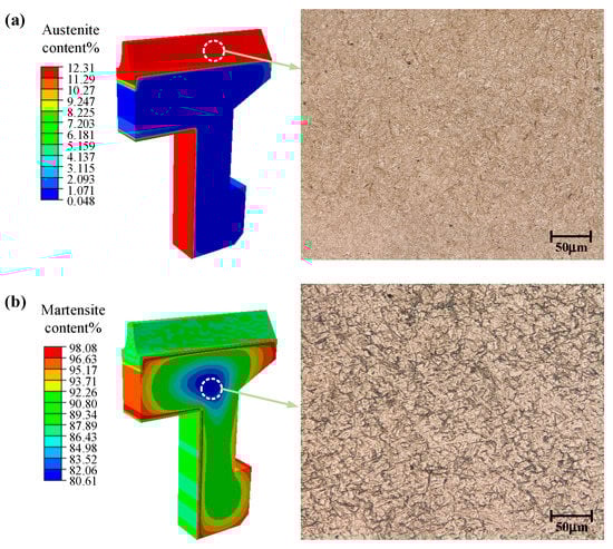Distribution of metallographic structure for the face gear after the quenching process: (a) Austenite; (b) Martensite.