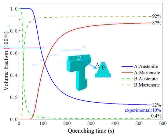 Phase transformation in the gear quenching process: A: tooth surface; B: tooth core.