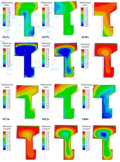 In the process of die quenching, the deformation trend of the gear had changed many times, and the key deformation and phase transformation nodes were extracted for analysis, as shown in Figure 12. Under the influence of the temperature field, the gear produced shrinkage deformations and no phase transformation occurred within 10 s of quenching. During 10 s to 20 s, the martensite transformation occurred in the subsurface layer of the gear, and the expansion deformation caused by phase transformation was greater than the shrinkage deformation caused by temperature. Constrained by the die and load, the outer tooth top of the gear was warped and deformed. From 20 s to 46 s, as the temperature decreased, the core of the gear gradually completed the martensite transformation. The amount of martensite transformation in the inner part of the gear was more than that in the outer part, resulting in a warping deformation at the inner tooth top of the gear. At this time, the overall deformation of the gear showed an expansion trend compared with 20 s. The martensite transformation was completed in the surface layer after quenching for 50 s to 200 s. There was more martensite transformation in the inner part of the surface layer, resulting in a greater expansion deformation. At this time, there was no temperature difference between the inside and outside of the gear, and the structure transformation was essentially completed. Due to the large strength and stiffness of the gear, the pressure applied by the upper die was not enough to suppress and eliminate the deformation, and the warping of the inner tooth top was kept in the subsequent quenching process. After quenching, the gear expanded compared to the initial state.