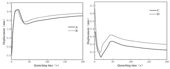 Four key positions were selected for deformation analysis: A and B represented radial displacement, while C and D represented axial displacement, as shown in Figure 13. The displacement changes at the key positions of the gear within 200 s of the quenching process are shown in Figure 14. The axial displacement and radial displacement both decreased in the initial stage of quenching, and the phase transformation began to occur at about 10 s, leading to increases in the displacements. The shrinkage deformation was greater than the expansion deformation at about 50 s, and the axial and radial displacements gradually decreased. Due to the limitation of the inner ring die, the radial displacement of B was less than that of A. Influenced by the warp of the tooth tip, the axial displacement of D located at the top of the tooth was larger than that of C.
