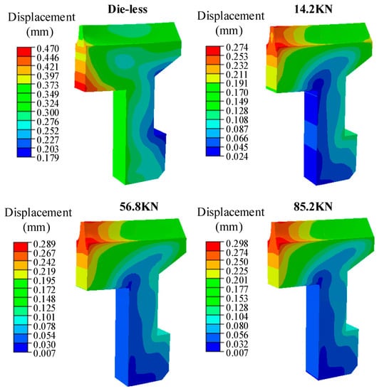 The load design of the die quenching is based mainly on experience and experiments. In order to minimize the distortion during the quenching, the load applied by the press should match the resistance required for anti-distortion. Simulation of the gear deformation trend under a variable force can reduce the number of experiments required to achieve the expected process results []. The load of face gear press’ was set as 14.2 kN, 56.8 kN, 71 KN, and 85.2 kN, and die-less was used as the deformation control group. The deformation cloud diagram of the gear after quenching is shown in Figure 15. The maximum deformation position of the die-less quenched gear was at the inner rib, the maximum deformation was 0.47 mm, and the minimum deformation position was 0.179 mm at the outer rib. The deformation at the top of the tooth was 0.36 mm. Constrained by the inner ring die and the upper die, the maximum deformation position of the die quenching of the gear was concentrated at the inner tooth top, and the minimum deformation position was at the inner rib. The maximum deformation at the inner tooth top increased with the gradual increase of the upper die load, and the top deformation and the minimum deformation of the gear approached a fixed value with the increase of the upper die load.