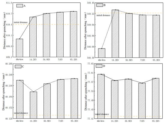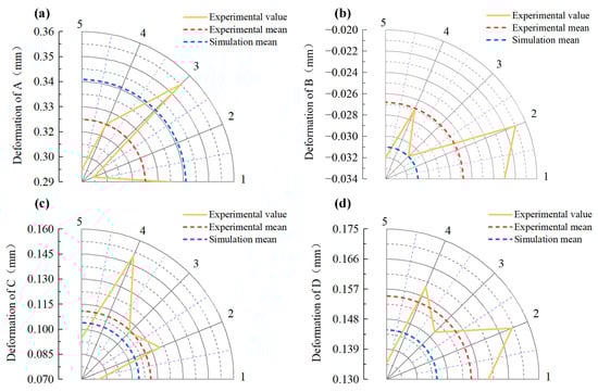 Five groups of quenching deformation experimental values were used to compare and verify the simulation values of gear deformation, as shown in Figure 20. Due to the warping deformation of the gear, the expansion occurred at A, C, and D. In the quenching process, B was restricted by the inner ring die and finally turned into shrinkage deformation. The errors between the simulation values of deformation and the experimental mean values were less than 15% at four different locations, which verified that the established simulation model could effectively predict the actual deformation.