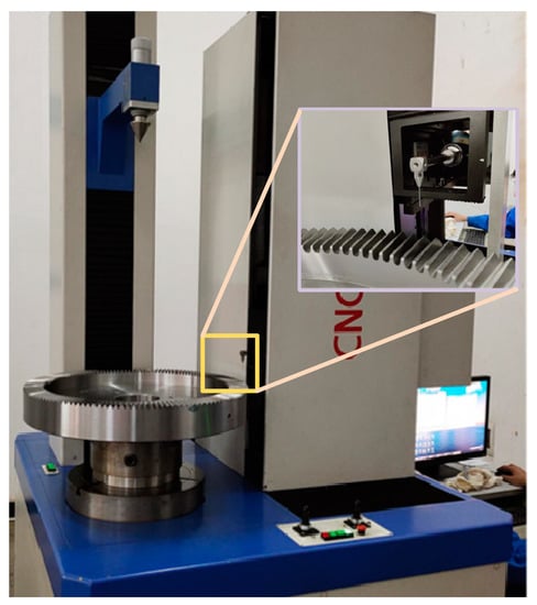 For the above simulation model parameters, the corresponding verification tests were carried out. Based on the heat treatment process route in Figure 5, the face gear was heated to 927 °C in the carburizing multipurpose furnace and held for 8 h for carburizing. The tooth surface and inner hub were carburized, and the other positions were protected by copper plating. After carburizing, the gear was cooled to room temperature under nitrogen protection. The gear was then heated to 621 °C for 4 h in an RJJ furnace, and cooled to room temperature with nitrogen after tempering. Before quenching, the gear was heated to 825 °C in an RJX furnace and held for 2 h to make the gear austenitic completely. An HEESS quenching press was used for load loading and unloading. After quenching, the gear was air-cooled to room temperature. In order to reduce the content of retained austenite and the internal stress of gears, a cryogenic treatment and tempering treatment were carried out after quenching []. The face gear press quenching equipment is shown in Figure 17. The inner hole and bottom surface of the gear were restricted by the die, and the top of the tooth was restricted by the upper die. The maximum load that the press could apply was 105 KN. The support force of the mandrel was 42 KN, the load of the upper die was 71 KN, and the pump power of quench oil flow was 1150 L/min. HVT-1000A image processing microhardness tester was used to measure the hardness of the gear. The test force was 500 gf, the load duration was 5 s, and the measurement multiple was 400 times. L65G gear measuring center was used to measure the gear coordinate. Compared with the ordinary coordinate, L65G can rotate the gear and the measurement method was more flexible. Figure 18 showed the process of the gear CMM measurement. The specific measurement positions are shown in Figure 13. The measurement results of the five groups of gear samples are shown in Table 5.