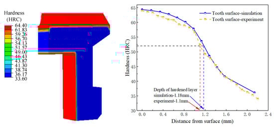 The surface hardness gradient of the face gear sample was measured. The hardness distribution of the gear is shown in Figure 19. The simulated value of the surface hardness of the carburized area was 64.6HRC, and the core hardness was 33.6HRC, which was fairly consistent with the measurement results in Table 5. The hardness values of the tooth surface were measured every 100 mm along the layer depth direction, and the variation trend of the experimental and simulation values was the same. The hardness values gradually decreased with the increase of the layer depth. Taking 550 HV hardness as the standard, the effective hardened layer depth of simulation was 1.18 mm, the effective hardened layer depth of experiment was 1.1 mm, and the error between the two was 7.27%.