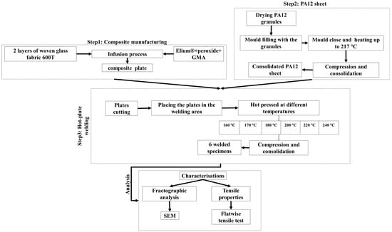 The welding was conducted at three separate steps. Step 1 was manufacturing glass fiber composite plates with an Elium® matrix. Step 2 was manufacturing PA12 sheets. Step 3 was hot-tool welding.