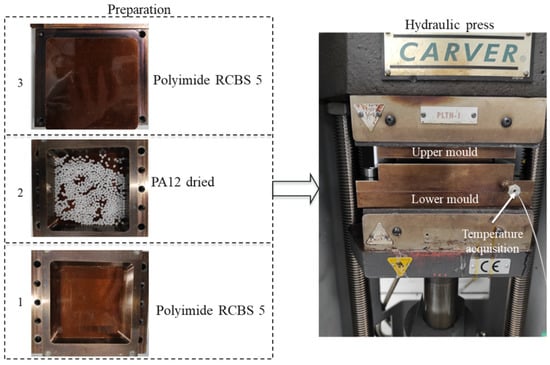 A compression molding machine (Figure 2 left) was used to melt and compress the pre-weighed PA12 granules from Arkema. The sheets were fabricated with the size 100 mm × 100 mm × 1.5 mm. The fabrication steps (Figure 2 right) started with drying PA12 granules at 80 °C for 12 h. Before filling the mold with 12 g dried PA12, the lower and the upper mold were covered by polyimide RCBS 5, which is a release film for thermoforming of thermoplastic materials up to 405 °C (see Figure 2). The mold was filled with PA12 granules and was subsequently closed. The process was followed with the mold heating to 217 °C to obtain the tool temperature of 200 °C. At 200 °C, a compression pressure of 0.5 MPa was applied and held for 10 min to achieve the desired sheet thickness. Finally, the consolidated PA12 sheet was demolded.