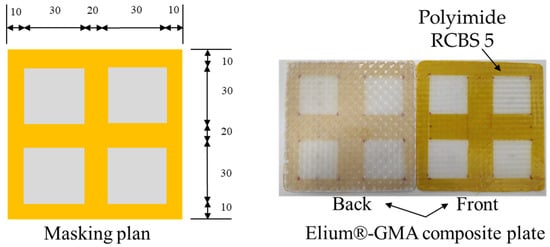 For the assembly, the two 100-mm squared plates were cut from the manufactured Elium® composite, and subsequently were masked with polyimide tape on the rough side (side faced with the vacuum bag) as shown in Figure 3. The masked plates were later dried at 80 °C for 12 h. Subsequently, the plates were cleaned with Diestone and dried again at 80 °C for 30 min.