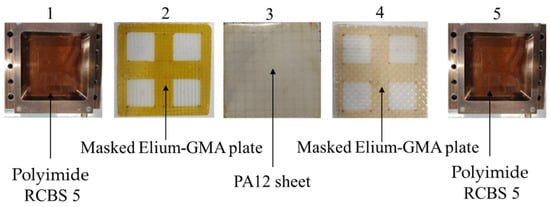 The assembly was started with stacking the first layer of polyimide RCBS5, a masked Elium®-GMA plate, a PA12 sheet, a masked Elium®-GMA plate, and the last layer of polyimide RCBS5 (Figure 4).