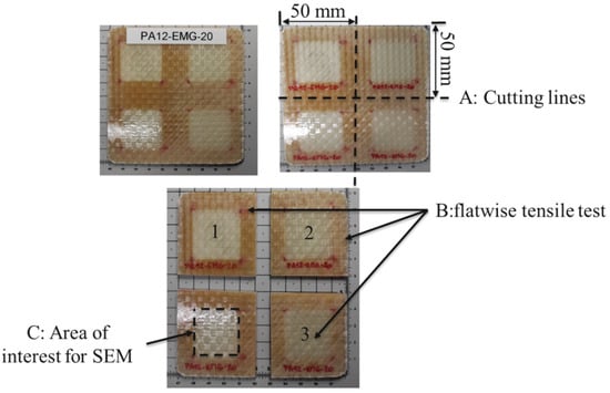Three specimens from each welded Elium® composite laminate-GMA-PA12 were cut. The cutting configuration was shown in Figure 5A. The surface area of a specimen was 50 mm × 50 mm with an average thickness of 2.9 mm. For each of the welding scenarios (see Table 1), three iterations (Figure 5B 1–3) for the tensile test were carried out at repeatable conditions (at a temperature of 23 °C and a relative humidity of 50%).