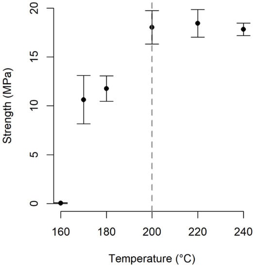 As seen in Figure 7, at a constant hold time and constant pressure, the max load value increased with increasing the welding temperature from 160 °C to 200 °C, after which the load values tend to fluctuate between 17 MPa and 20 MPa with a further increase in the temperature. Therefore, the compatibilizer efficiency increases rapidly with increasing temperature. At 160 °C, which is below the melting point of PA12, the chain mobility was restricted, which, in turn, cannot induce the interaction of chain molecules []. At this temperature (160 °C), the joint of the interposed PA12 sheet and the EMG composite was broken at the little strength of 0.06 MPa due to insufficient reaction []. However, at 200 °C, as PA12 melting occurs [], the welding strength of PMMA-PA12 by GMA reached 18 MPa, which is 300 times higher than the welding strength of PMMA-PA12 by GMA at 160 °C. This shows that fusion bounding between PMMA and PA12 by interfacial compatibilization was successfully achieved under hot-plate welding at 200 °C.
