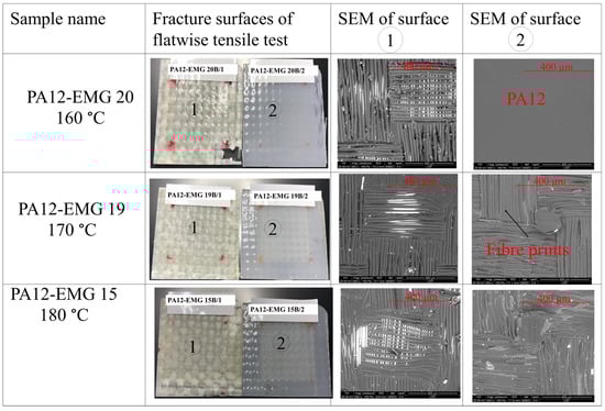 Fracture surfaces and SEM images of PA12-EMG specimens welded at temperatures of 160 °C, 170 °C, and 180 °C. The surface 1 stands for the EMG composite and the surface 2 stands for the interposed PA12 sheet.
