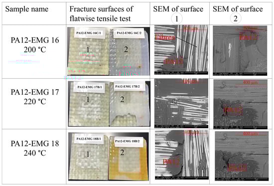 Fracture surfaces and SEM images of PA12-EMG specimens welded at temperatures of 200 °C, 220 °C, and 240 °C. The surface 1 stands for the EMG composite and the surface 2 stand for the interposed PA12 sheet.