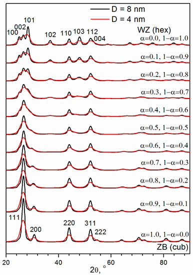 Assuming a two-phase system, some authors use the intensity ratio of the 103 and 110 peaks of the WZ structure to infer the phase ratio ZB:WZ [46,47]. The intensity of 103 peak at ~48° is only assigned to the WZ modification of CdS, while the intensity of the 110 peak at ~44° may be contributed by both ZB and WZ crystal structures. Therefore, for pure ZB and WZ modifications this ratio is ideally zero and nearly one, respectively. However, one can see (Figure 4) that in the case of lamellar intergrowth of ZB and WZ structures in nanoparticles (D < 8 nm) 103 peak is not observed for α = 0.5 ÷ 1 due to the large broadening of this peak. So the intensity ratio of the 103 and 110 peaks is zero not only for pure ZB modification but for the lamellar intergrowth with 0 < WZ:ZB < 1 (0 < (1 − α):α < 1).