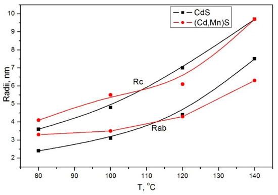 As a result of the model optimization, it turned out that for all temperatures, nanocrystalline particles Cd0.7Mn0.3S have an ellipsoidal shape, as was the case for CdS particles synthesized under the same conditions [44]. Ellipsoids are elongated along the direction normal to the planes of SFs. The average radii of ellipsoidal particles increase with the temperature (Figure 6). If we compare the dependence of radii on temperature for Cd0.7Mn0.3S and CdS nanoparticles, we can see that initially (T = 80 °C), the average size of Cd0.7Mn0.3S particles is larger than the size of CdS particles. However, as the temperature increases, the size of Cd0.7Mn0.3S particles increases more slowly compared to CdS. It can be assumed that the nanocrystalline β-Mn3O4 located between Cd0.7Mn0.3S particles slows down their growth.