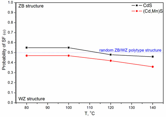 A comparison of the defect structures of Cd0.7Mn0.3S and CdS nanoparticles synthesized at T = 80 °C and 100 °C shows that both compounds have a very disordered structure (Figure 7). However, the Cd0.7Mn0.3S structure is more WZ-like (α = 0.47, 1 − α = 0.53), and the CdS structure is more ZB-like (α = 0.55, 1 − α = 0.45). Further increase in the processing temperature leads to a decrease in the probability of SFs in the WZ structure α, from 0.47 to 0.36 for Cd0.7Mn0.3S and from 0.55 to 0.46 for CdS. Therefore, with increasing temperature, the structure of both compounds transforms in the direction from ZB to WZ structure, and Mn2+ ions facilitate this transformation.