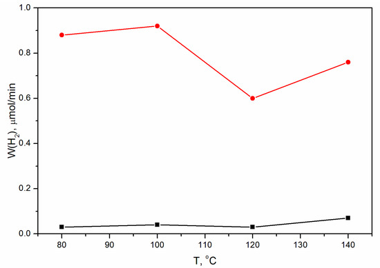 Dependence of the hydrogen evolution rate for CdS (black squares) and Cd0.7Mn0.3S-based catalysts (red circles) on the synthesis temperature T.