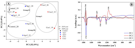 For multivariate analysis, Statistica 13 (TIBCO Software Inc. PaloAlto, CA, USA) and OriginPro (OriginLab Corporation, Northampton, MA, USA) were used. Before chemometric analysis, the obtained FTIR spectra were preprocessed using OriginPro and Grams/AI 8.0 software (Thermo Fisher Scientific, Waltham, MA, USA). Subsequently, preprocessing steps including Savitzky–Golay smoothing (5-point window, second order polynomial), multi-point baseline correction, Y offset correlation and mean center were used. After the data processing step, unsupervised methods such as Principal Component Analysis (PCA) and Hierarchical Clustering Analysis (HCA) were employed in the wavenumber region of 1850–500 cm−1.