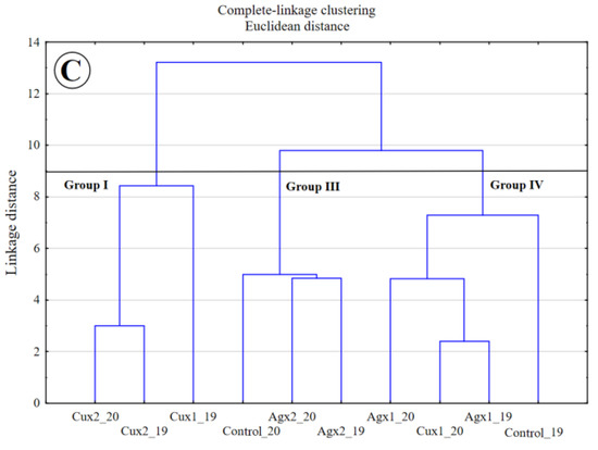 In the first year of cultivation (2019), the level of C16:0 decreased by 1.13% relative to the control in the (x1) AgNPs variant. In the case of C18:2, a noticeable decrease of 0.38% was recorded after the (x2) application of AgNPs. The content of C20:1 in rapeseed oil also decreased after the (x1) application of both AgNPs and CuNPs as well as (x2) CuNPs. The respective decrease was 0.55%, 0.55%, and 1.64% relative to the control.