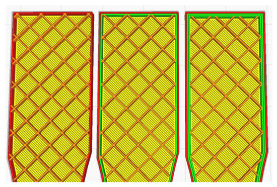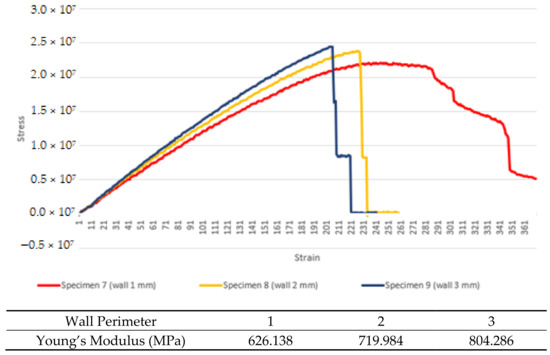 From Figure 9, the max stress of the experimental part is slightly better for higher wall perimeter. This follows the same trends with the simulation parts, even with high differences between the value of the simulated and the experimental parts. The Young’s modulus values of specimens 7, 8 and 9 are 626.138 MPa, 719.984 MPa and 804.286 MPa, respectively.