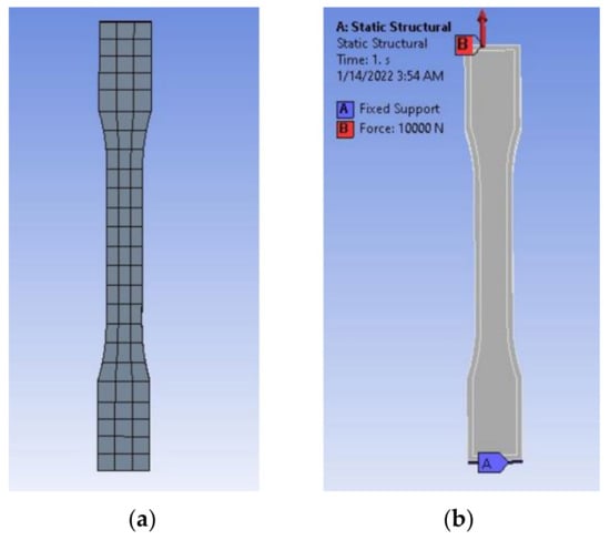 (a) Meshing of the specimen and (b) boundary and loading conditions of 10 kN.
