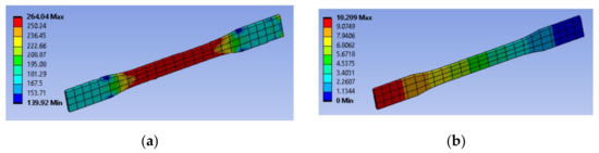Sample outcomes of the simulation for (a) maximum stress (MPa) and (b) elongation (mm).