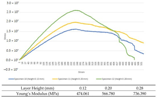 Due to the current limitation of simulation technology to define the difference in layer height structure, no simulated part was performed for the layer height testing. However, experimental testing shows that higher layer height values result in better max stress and thus better a Young’s modulus as in Figure 10. The Young’s modulus values of specimens 10, 11 and 12 are 474.061 MPa, 566.78 MPa and 736.39 MPa, respectively.
