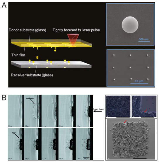 Printing of materials starting from a solid donor film following two different scenarios. (A) Melted material, where the final output corresponds to individual spherical particles. Reprinted under creative commons permission (CC BY-NC-ND 4.0) from [8], copyright 2018, De Gruyter. (B) In this transfer, the use of a sacrificial layer allowed the printing of an array of microspheres that followed the square shape distribution of the incident laser beam. Reprinted with permission from [9], with the permission of AIP Publishing (Copyright 2010).