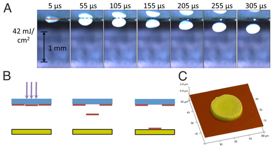 (A) Snapshots of a high-speed video of the transfer via LIFT of a high viscosity silver paste. In the top figure, a single laser pulse with a circular shape comes from the top, pushing downwards a ‘coin-like’ voxel that flies towards the receptor substrate without breaking. The schematics is included in (B), and a topography acquired via AFM of the final printed material is shown in (C). The figure has been reprinted from [10], with the permission of AIP Publishing (Copyright 2013).