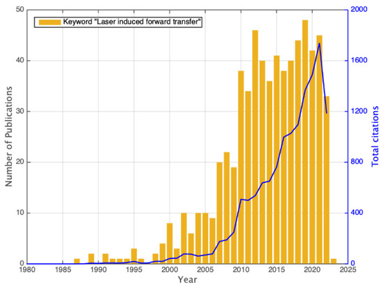 Number of published peer-reviewed articles (grand total of 661) and total number of citations per year. Data obtained via the ISI Web of Science, by sorting the keyword “laser induced forward transfer” as of 11 November 2022.