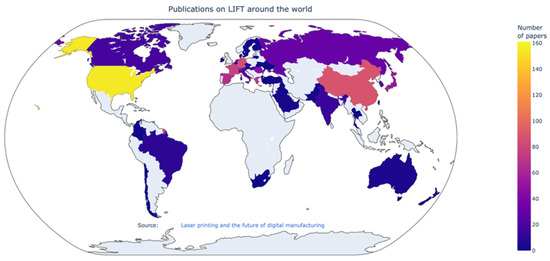 Geographical distribution of the total amount of publications per country on LIFT around the world. Data obtained via the ISI Web of Science by sorting the keyword “laser induced forward transfer” as of 8 June 2022. An interactive resource is available as a Supplementary Material.